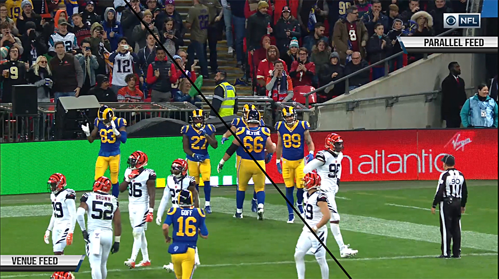 Bei Parallel Ads zeigen die LED-Banden nicht ein einziges Bild, sondern mehrere verschiedene Bilder in extrem schneller Abfolge – so schnell, dass das menschliche Auge nur eines davon wahrnimmt. Die TV-Kameras hingegen können durch ihre spezifische Bildfrequenz und Verschlusszeit unterschiedliche Bilder erfassen. Dadurch werden bis zu vier verschiedene Feeds gleichzeitig produziert, ohne dass ein digitaler Overlay im Nachhinein erfolgt. Das Bild wird nicht ersetzt – es werden einfach verschiedene Signale von derselben physischen Bande gesendet.